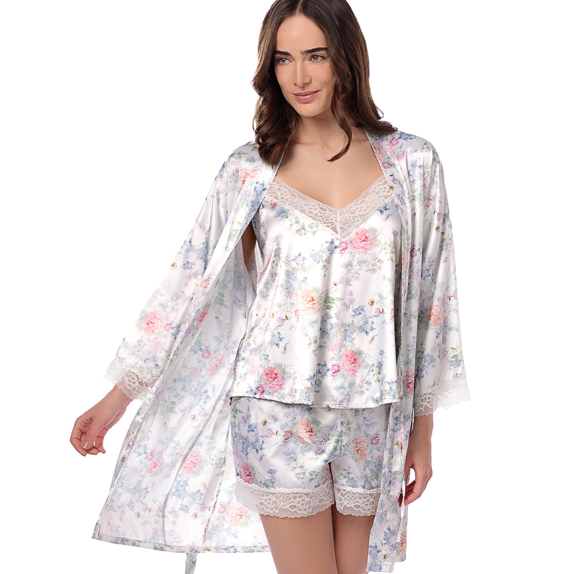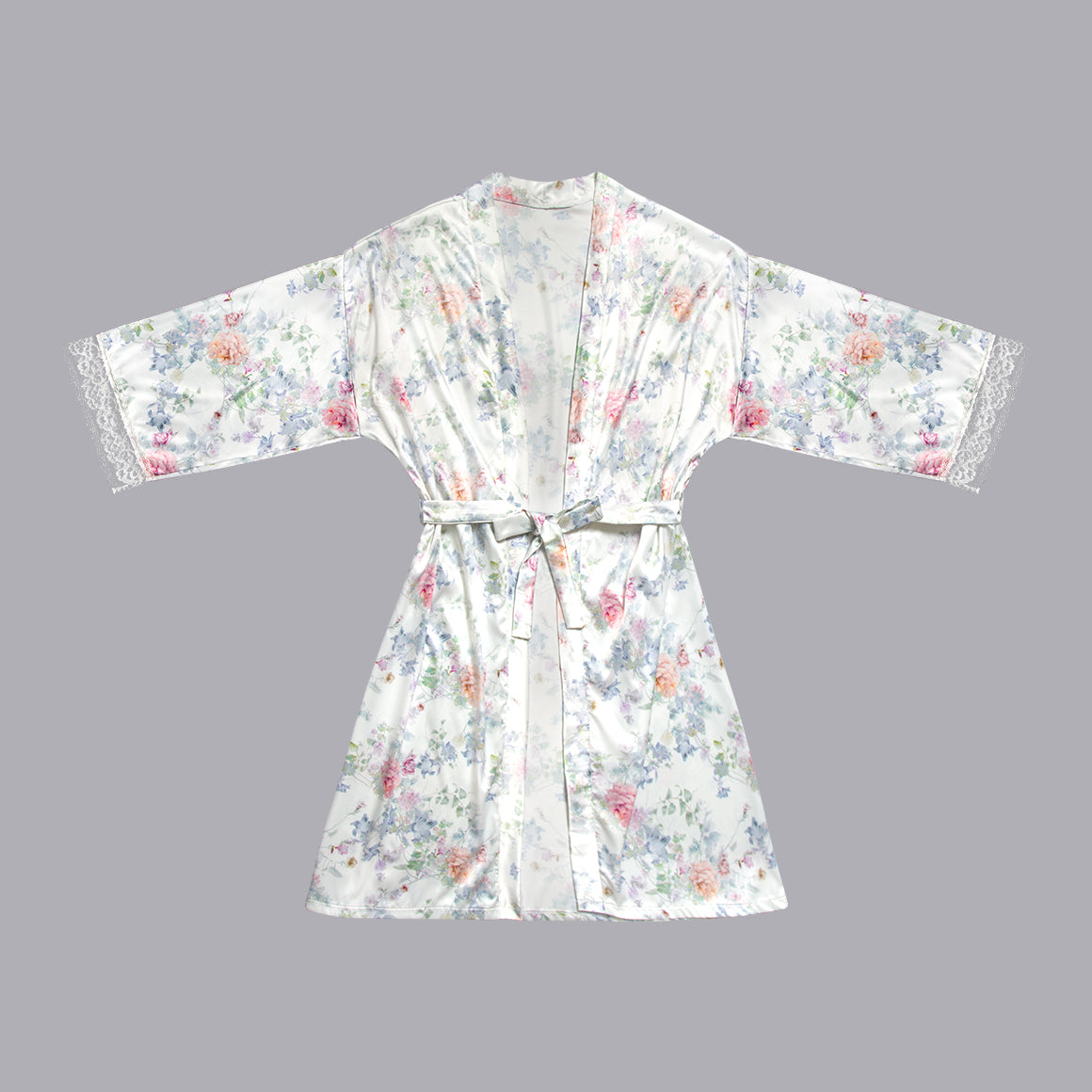 Bata con mangas sueltas con dos cordones en cintura (uno interno y el otro externo) para ajustarse. elaborado con tela de satín y encaje en ruedo de mangas.