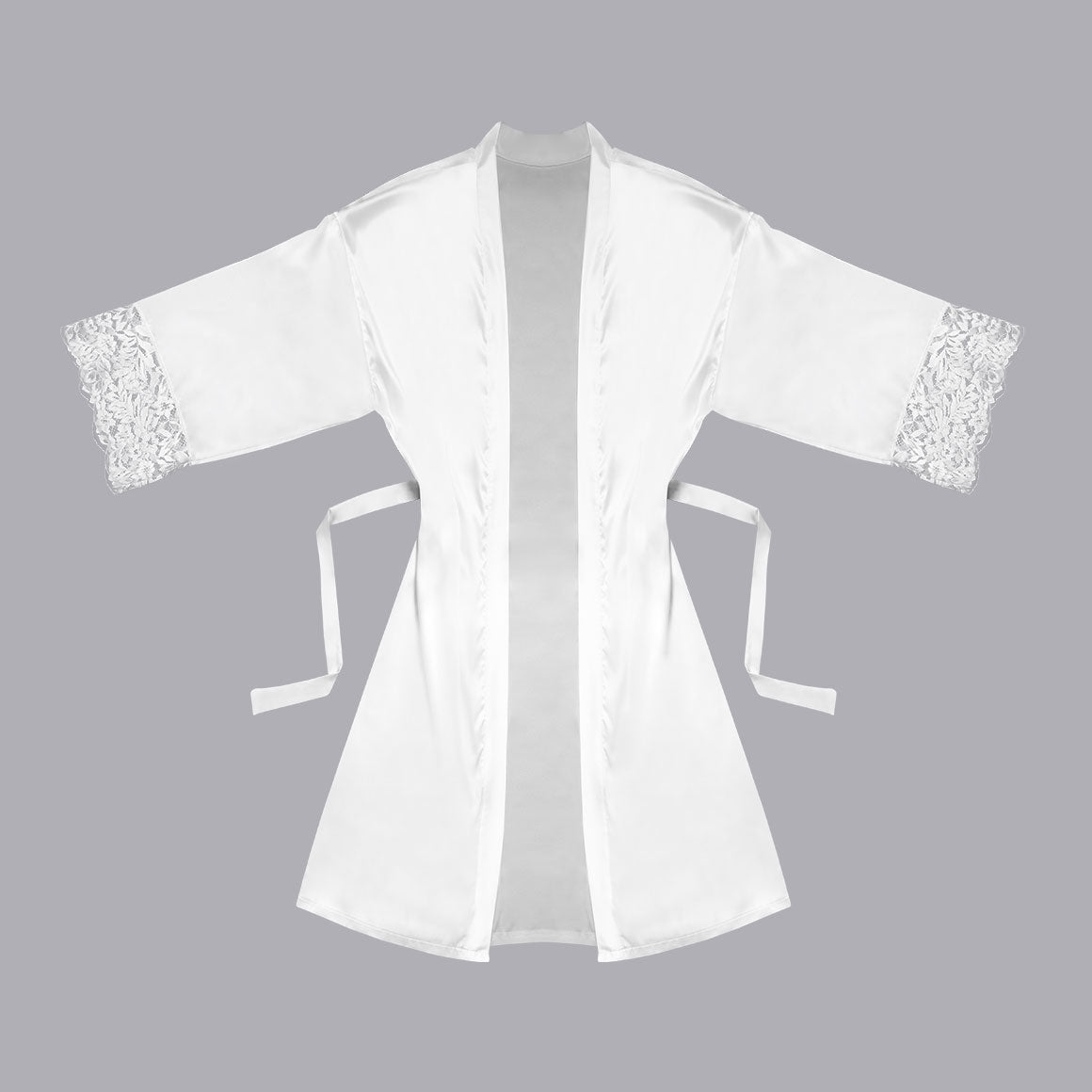 Bata con mangas sueltas con dos cordones en cintura (uno interno y el otro externo) para ajustarse. elaborado con tela de satín y encaje en ruedo de mangas.