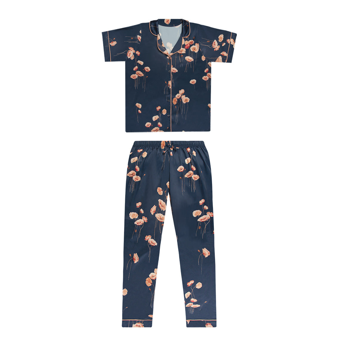 Pijama de dos piezas, elaborado de satin. blusa con mangas con detalle de cinta decorativa en ruedo y en el contorno del cuello y cierre de botones enfrente. pantalón largo con detalle de cinta decorativa en ruedo y cintura elástica para un mejor ajuste.