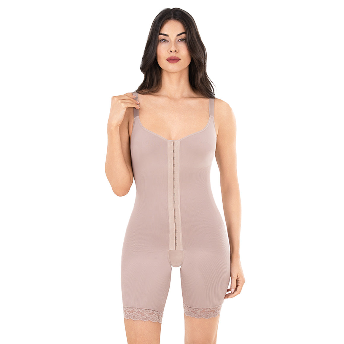 Faja moldeadora enteriza de media pierna. descubre la combinación perfecta de confort e innovación con nuestra faja elaborada con hilo emana. esta faja moldeadora anticelulitis ofrece beneficios cosméticos visibles, como la reducción de la apariencia de la celulitis y la mejora en la elasticidad de la piel. incluye tirantes ajustables, una amplia apertura higiónica para facilitar el uso del baño y zonas preformadas en busto y gléteos para una silueta naturalmente esculpida. moldea efectivamente tu figura gracias al tejido con malla reforzada en el torso y los muslos. ademés, ofrece compresión moderada a la altura del busto, brindando un soporte suave. su abertura frontal con 2 niveles de ajuste y broches forrados que no entran en contacto con la piel garantizan mayor comodidad. ideal para usar debajo de ropa ligera o prendas de verano.