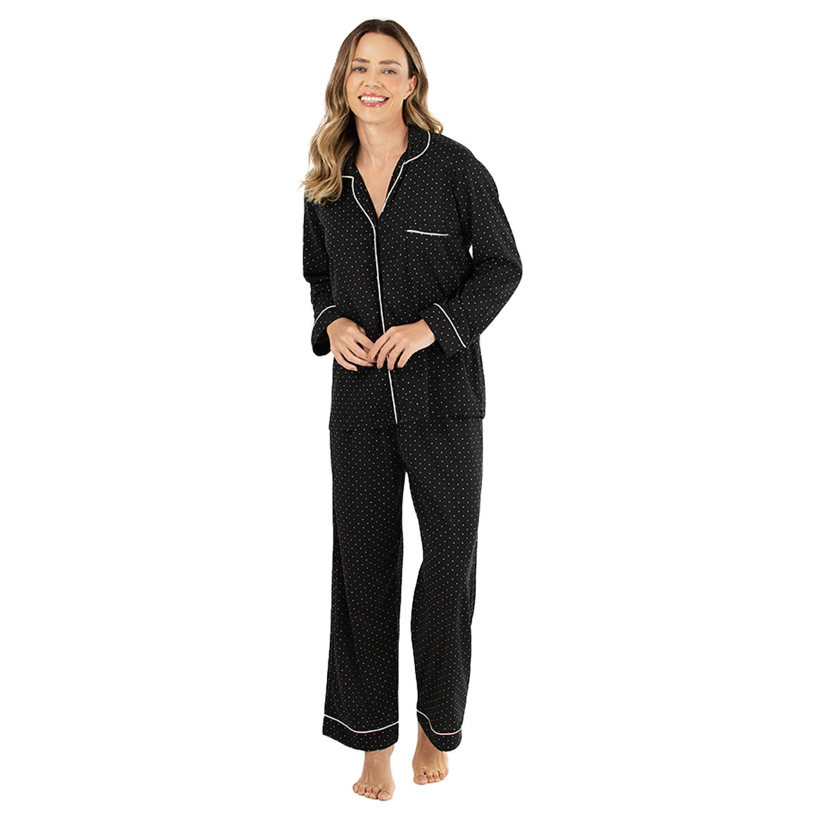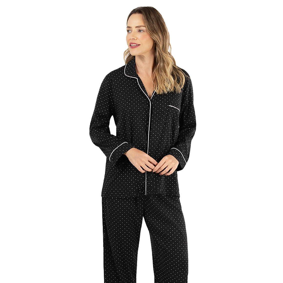 Pijama de dos piezas, elaborado con tela de dacrón suave. blusa de manga larga destacada por su diseño moderno, realzado con cinta decorativa en ruedo y en el contorno del cuello, botones al enfrente y bolsillo delantero. pantalón largo completa el look con una silueta cómoda, detalle cinta decorativa en los ruedos y cintura elástica que se adapta con suavidad a tu cuerpo. perfecto para noches relajadas con un toque de distinción.