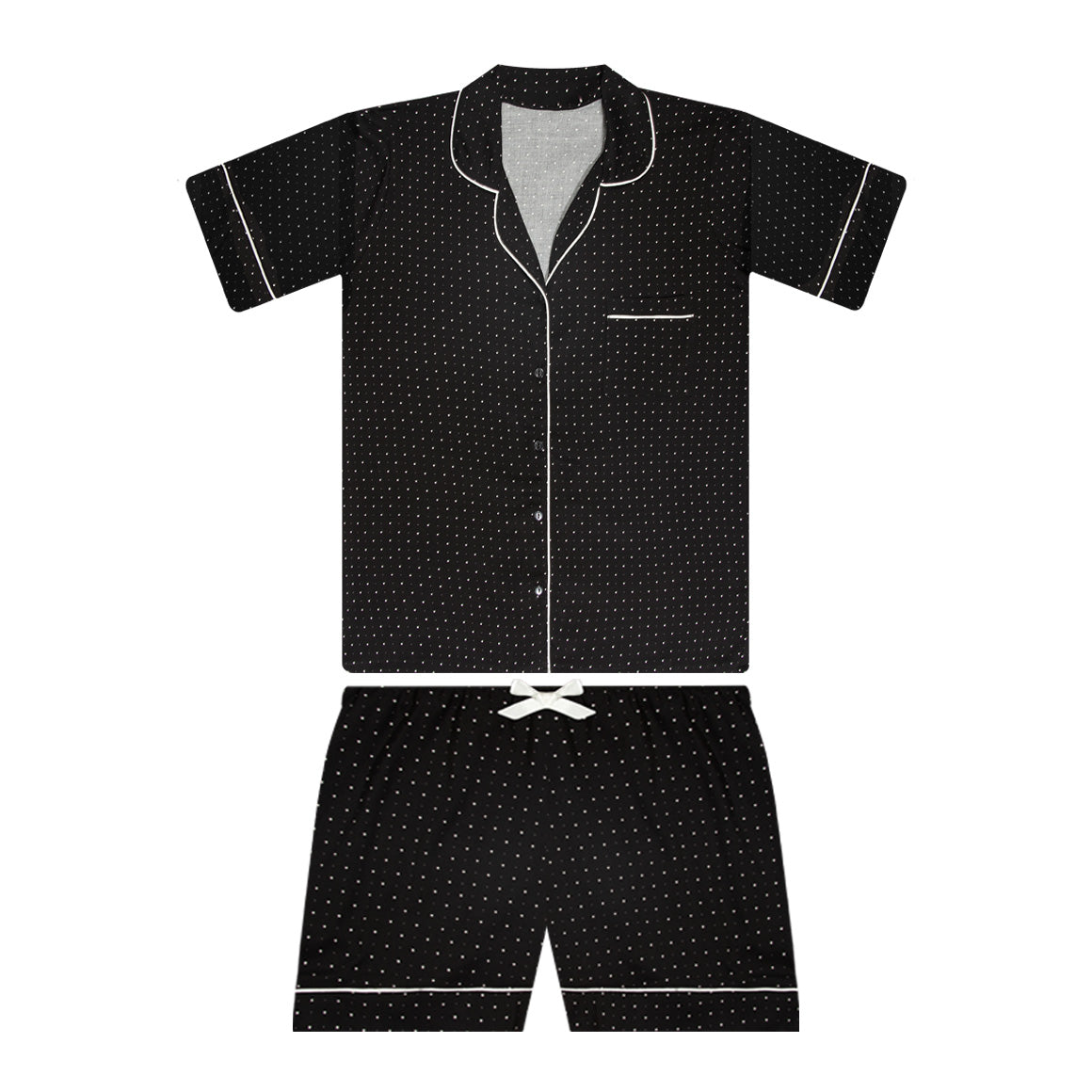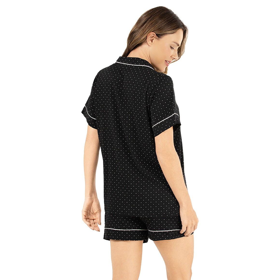 Pijama de dos piezas, elaborado con tela de dacrón suave. blusa de manga corta destacada por su diseño moderno, realzado con cinta decorativa en ruedo y en el contorno del cuello y botones al enfrente. pantalón corto (short) completa el look con una silueta cómoda, detalle cinta decorativa en los ruedos y cintura elástica que se adapta con suavidad a tu cuerpo. perfecto para noches relajadas con un toque de distinción.