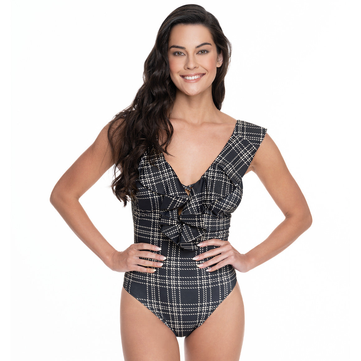 Traje de baño entero con copas ligeramente prehormadas sin realce(no push up) y removibles. tirantes anchos con volado que va desde el escote en v hasta la espalda y con detalle de cintas cruzadas en el centro frontal. cobertura media de la parte posterior del panty y escote de pierna alta. elaborado de spandex suave con forro de poliéster y elástico en los contornos para un mejor ajuste.
