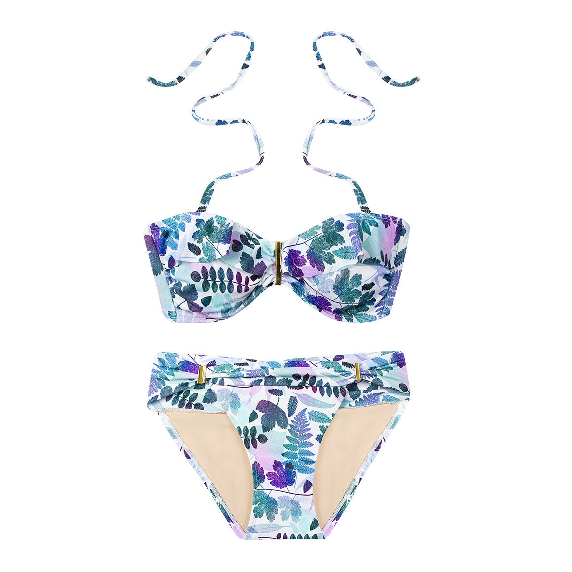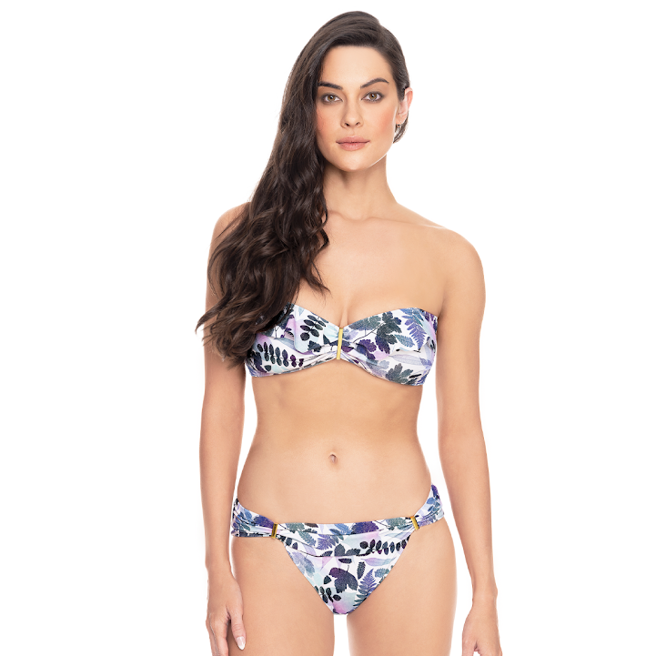 Traje de baño de dos piezas, elaborado de microfibra estampada. top con tirantes halter y removibles, copas ligeramente prehormadas sin realce y extra�bles, volado decorativo en la parte superior y detalle metálico en el centro, varillas laterales, elástico en espalda y hebilla con cuatro niveles de ajuste. panty con talle medio y cobertura media, elástico escondido en piernas y cintura, detalles metálicos a los lados de la parte frontal y fruncido en la posterior de la cintura, con forro que permite la salida de arena.