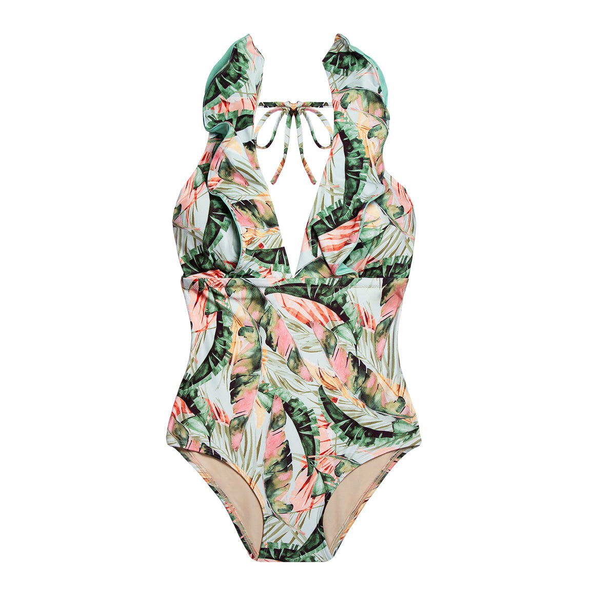 Traje de baño entero, volados que va desde el escote frontal hasta la espalda con cordón de amarre en la parte superior y copas prehormadas, sin realce y removibles. cobertura media de la parte posterior del panty y escote de pierna alta. elaborado de microfibra, forro de poliéster y elástico en los contornos para un mejor ajuste.