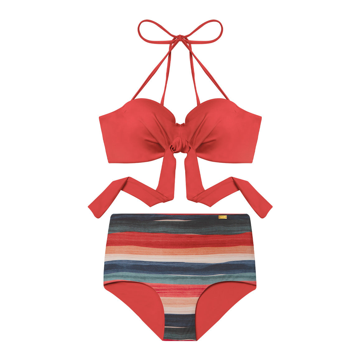 Traje de baño de dos piezas, elaborado de microfibra. top multiusos, tirantes halter removibles, copas prehormadas, aros, varillas laterales, elástico en las orillas y broche de hebilla con cuatro niveles de ajuste. panty reversible con talle alto y cobertura tipo cachetero, elástico escondido en pierna y cintura.