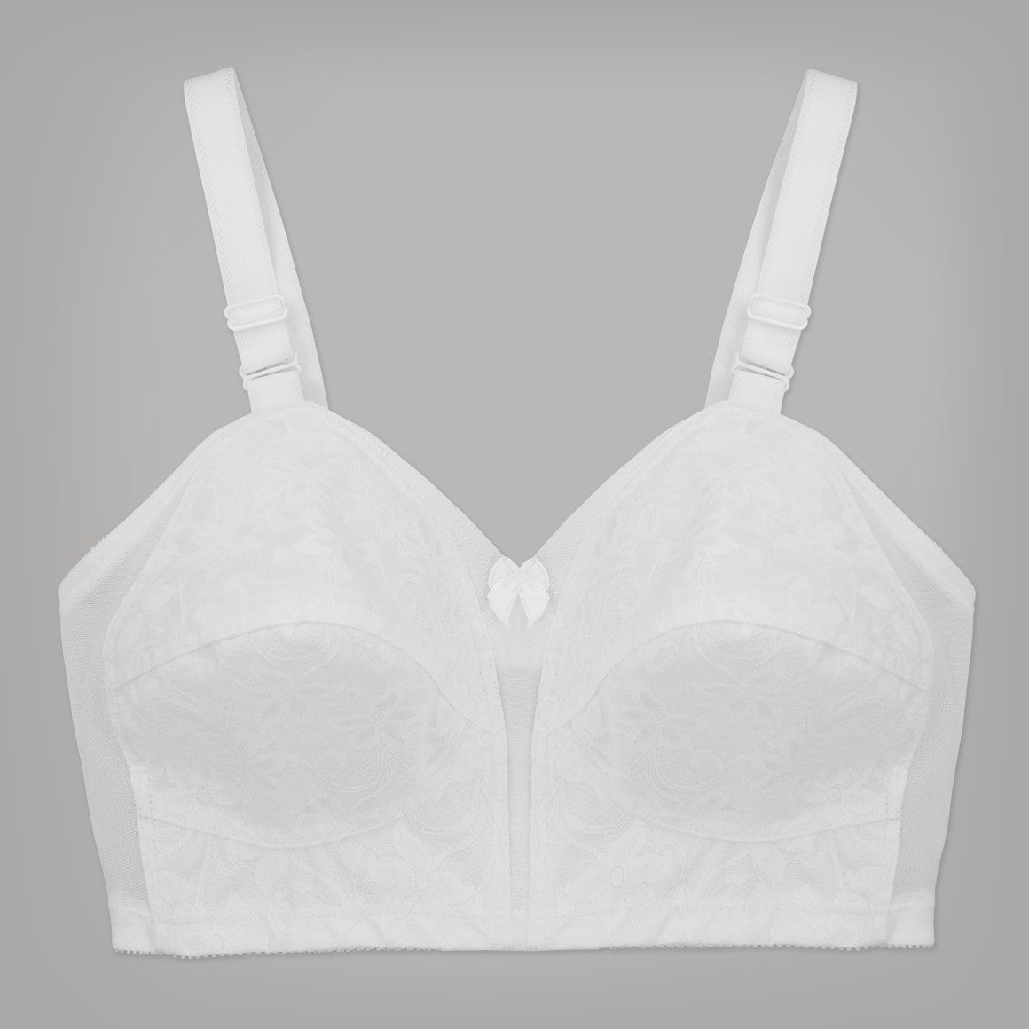 Brasier sin aros, copas sin realce con refuerzo. banda ancha con elástico para un mejor ajuste. broche de cuatro ganchos y tres niveles de ajuste, con tirantes anchos regulables. elaborado de powernet, encaje en copas y parte frontal de banda.