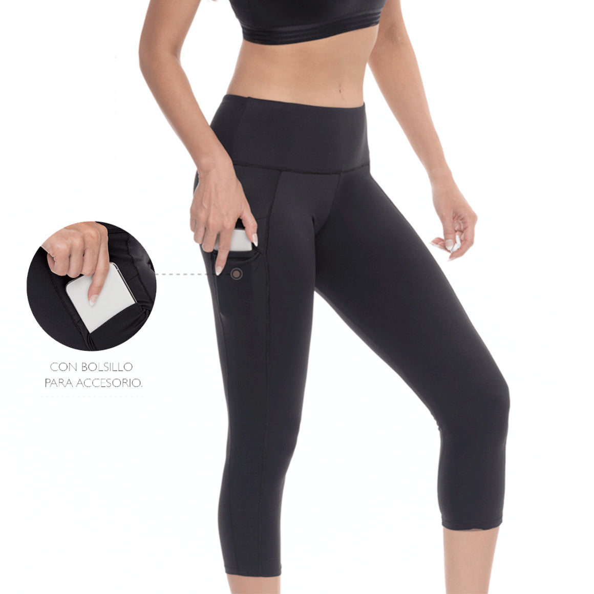 Leggins deportivas con talle medio, silueta ajustada y largo debajo de las rodillas. elaborado de microfibra. cuenta bolsillo al lado derecho y paneles laterales.
