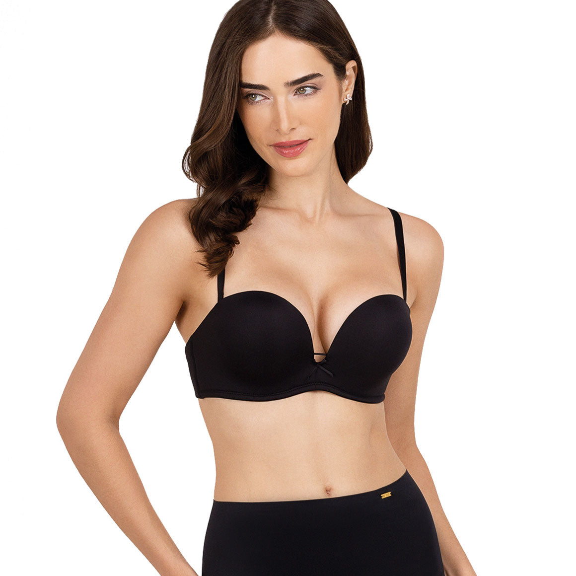 Brasier strapless con aros escondido, copas prehormadas con doble realce. banda angosta reforzada con doble tela y elástico antideslizante, con varillas laterales y broche de tres ganchos y tres niveles de ajuste, tirantes removibles y regulables. elaborado de microfibra. ideal para escotes.