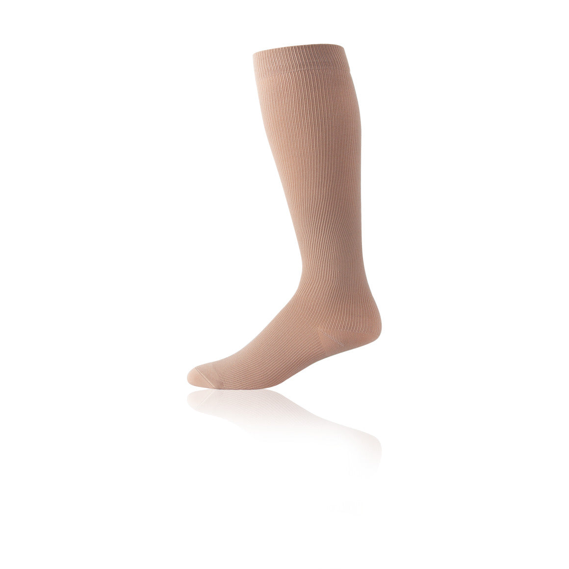 Calcetín de compresión moderada para dama con cobertura hasta debajo de la rodilla. elaborado con nailón y elastano. estimula la circulación, para impedir y aliviar la inflamación. previene dolores, cansancio y calambres.